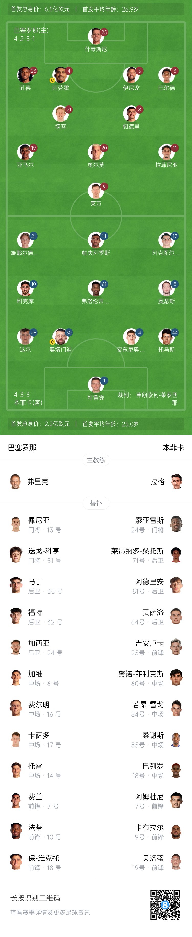 巴薩替補(bǔ):13-佩尼亞、31-科亨、6-加維、7-費(fèi)蘭-托雷斯、10-法蒂、14-托雷、16-費(fèi)爾明、17-卡薩多、18-保-維克托、24-埃里克-加西亞、32-福特、35-杰拉德-馬丁