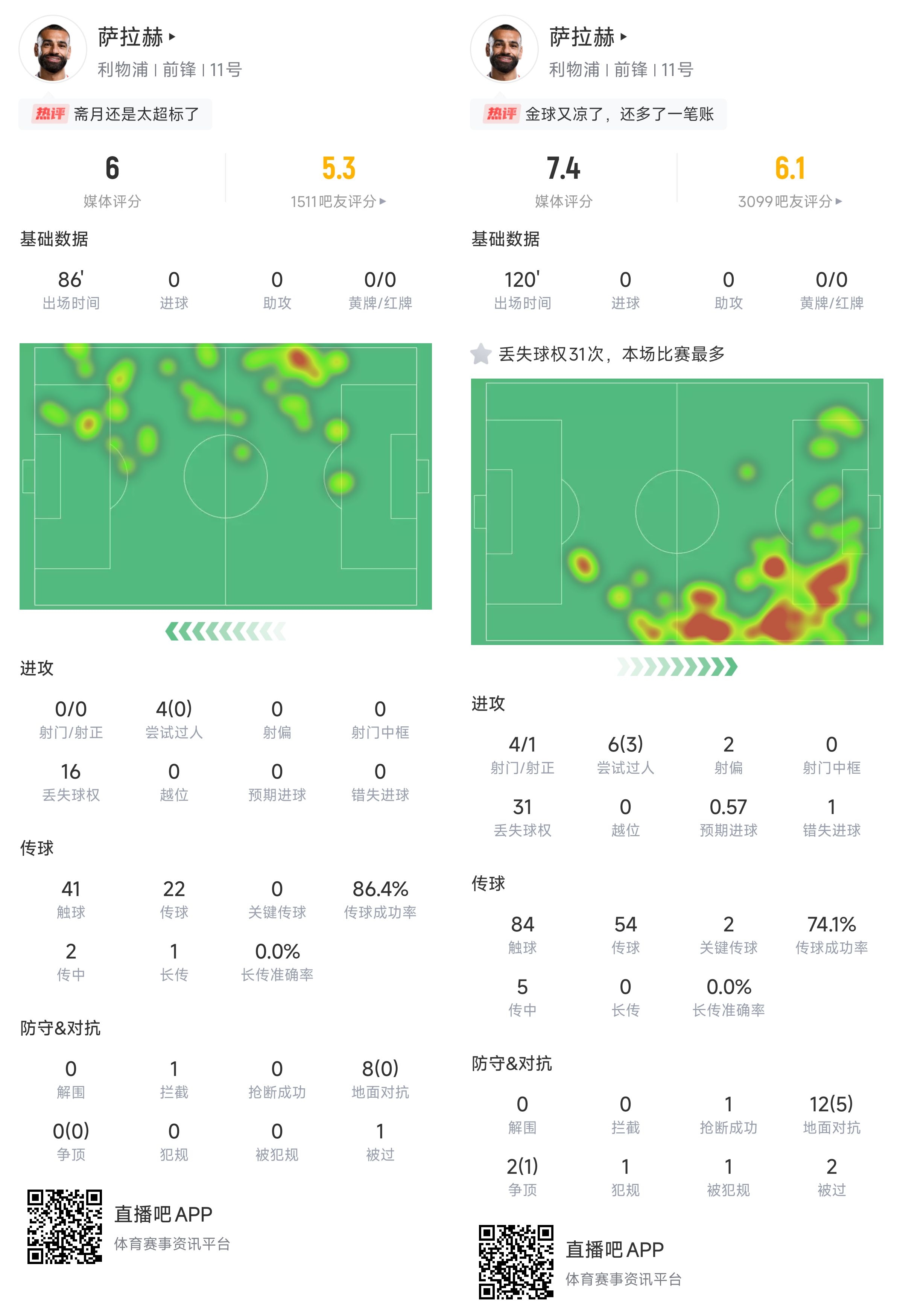 薩拉赫在兩回合的表現(xiàn)中都不算好。首回合埃及法老多項數(shù)據(jù)掛零,甚至可以說是極差,第86分鐘的時候被換下。次回合薩拉赫狀態(tài)轉(zhuǎn)好,但是仍不佳。本場他打滿全場并在點球大戰(zhàn)罰進,賽中4射1正,過人6次成功3次,對抗14次成功6次,觸球84次丟失球權(quán)31次……