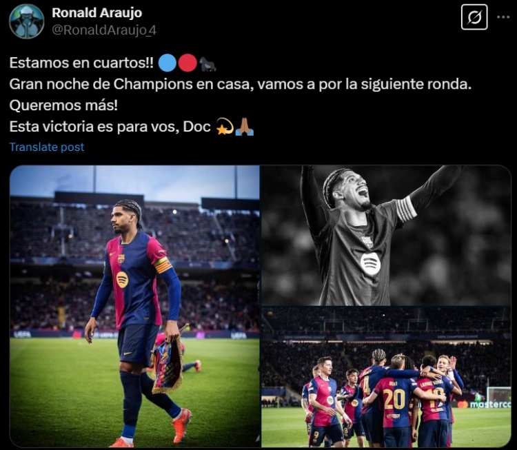 巴薩隊(duì)長阿勞霍也在賽后社媒曬照,將勝利獻(xiàn)給球隊(duì)已故隊(duì)醫(yī),配文寫道:“我們晉級(jí)8強(qiáng),很棒的歐冠主場之夜,讓我們晉級(jí)下一輪!我們還想要更多。勝利獻(xiàn)給你,醫(yī)生?!?/p>