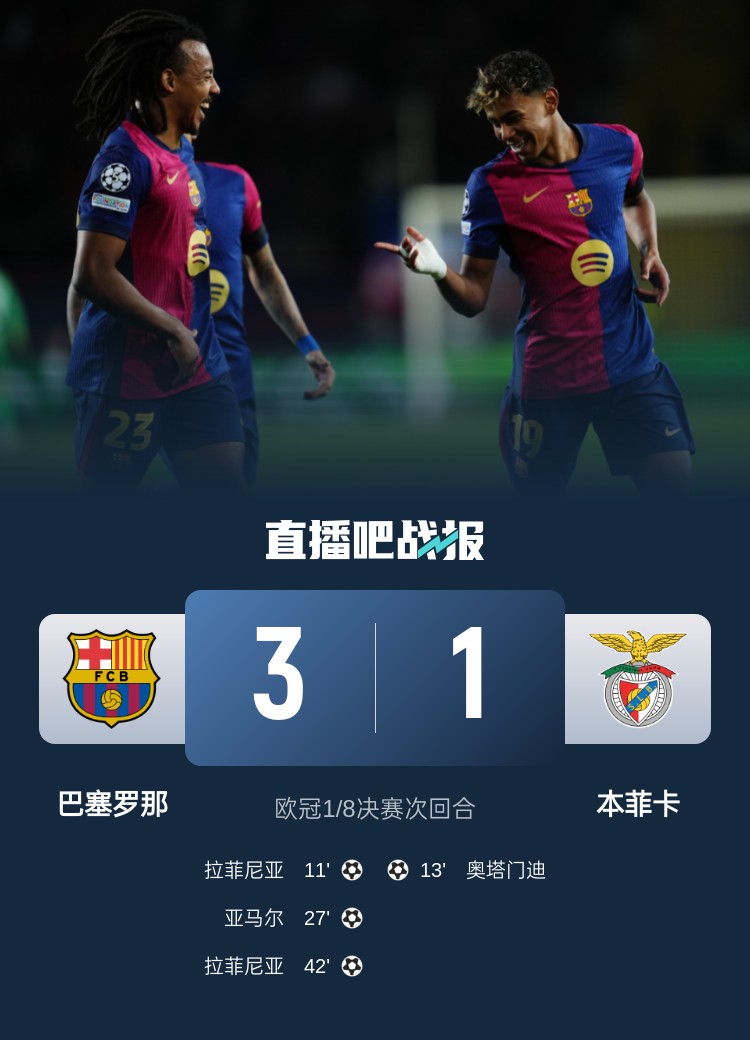 雙殺進(jìn)8強(qiáng)!巴薩3-1總比分4-1本菲卡 拉菲尼亞2射1傳亞馬爾傳射