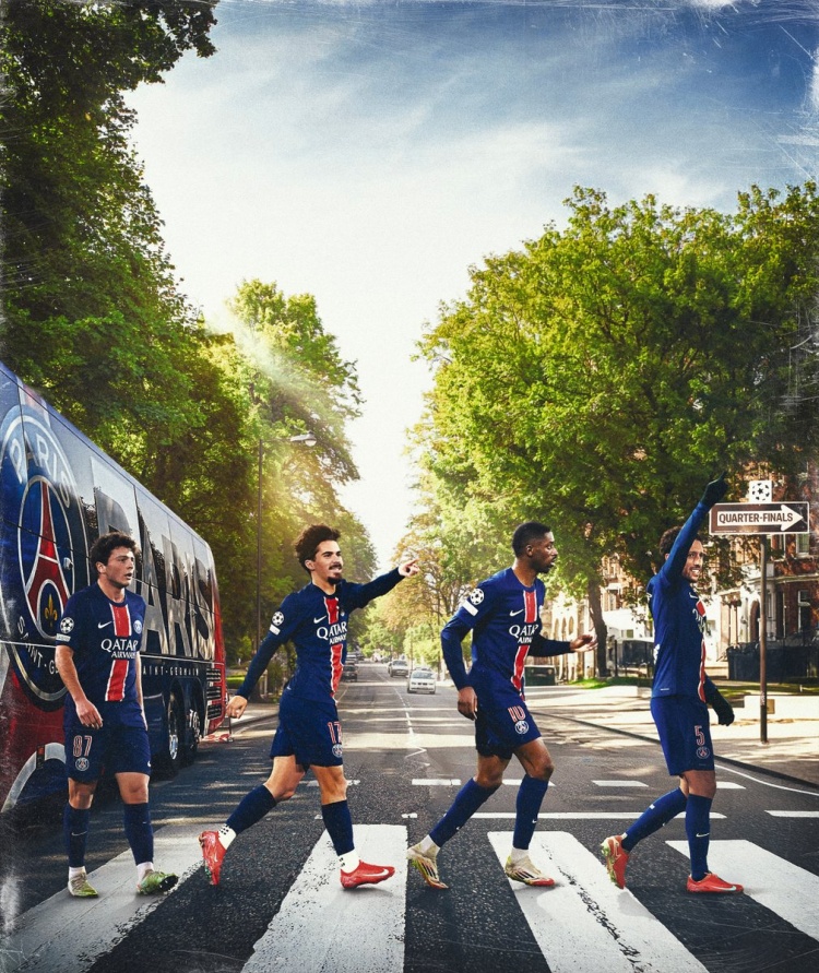巴黎社媒賽后曬披頭士風(fēng)格海報(bào)慶祝晉級(jí),若奧-內(nèi)維斯、維蒂尼亞、登貝萊、馬爾基尼奧斯以及球隊(duì)大巴出現(xiàn)在畫面中,箭頭直指1/4決賽。