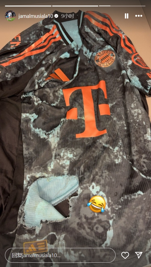 本場比賽賽后,穆西亞拉更新社媒,曬出自己球衣右側(cè)破了一個大洞的動態(tài)。