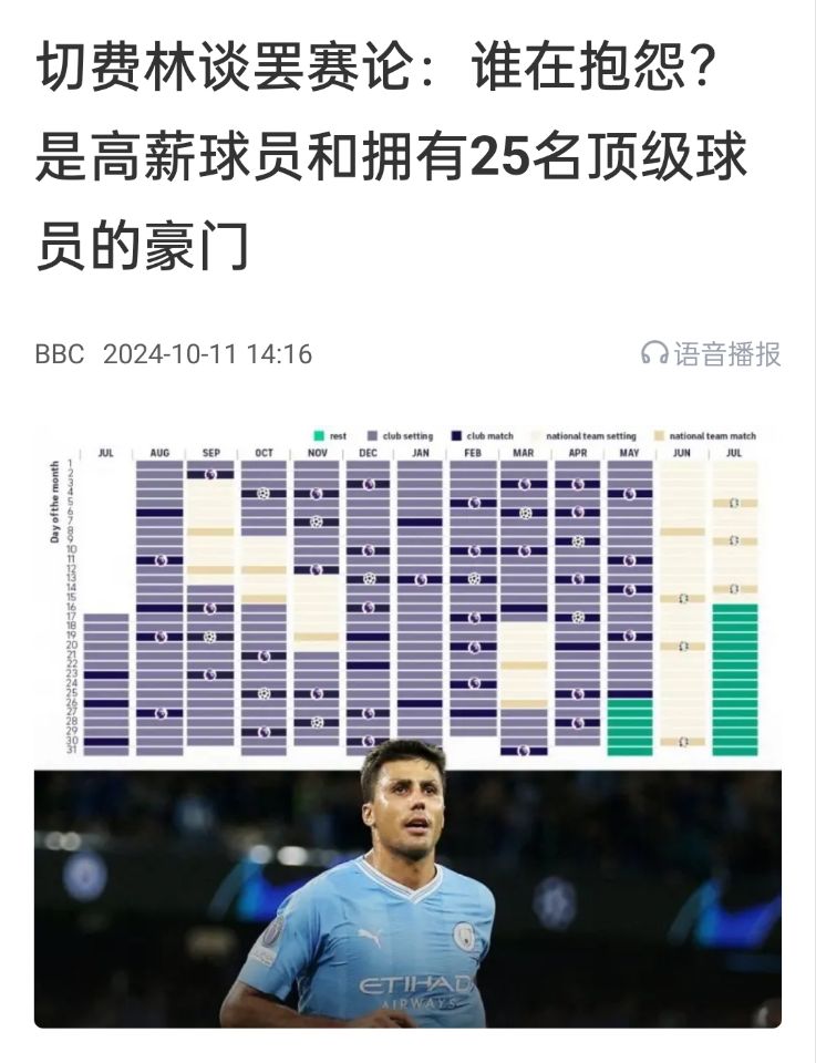 但對于這種抱怨,也存在相反的看法。比如歐足聯(lián)主席切費(fèi)林曾在采訪回應(yīng),抱怨賽程最多的就是那些大俱樂部和高薪球員。但他們?nèi)找媾蛎浀母咝角∏【托枰銟凡慷嗵弑荣悂碇?。如果他們不愿減薪,那賽程縮減也很難辦。
