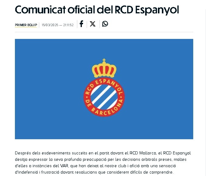 西班牙人足球俱樂(lè)部始終對(duì)裁判團(tuán)隊(duì)保持有最高尊重,并將繼續(xù)如此,充分認(rèn)可裁判工作的復(fù)雜性與責(zé)任重大性。然而,俱樂(lè)部認(rèn)為這種尊重應(yīng)當(dāng)是相互的,應(yīng)該體現(xiàn)在對(duì)百年俱樂(lè)部、球員、教練團(tuán)隊(duì)和球迷的公平對(duì)待上。