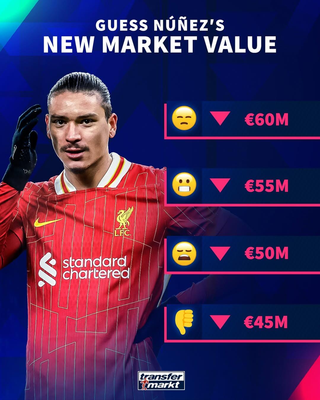 03月17日訊 德國轉(zhuǎn)會市場將在3月18日更新英超聯(lián)賽球員身價,德轉(zhuǎn)更新前預(yù)熱,努涅斯身價將下跌。