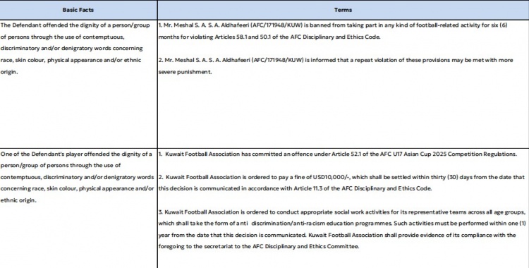 3月17日訊 2024年10月25日U17亞洲杯預選賽科威特對陣澳大利亞的比賽中,科威特球員米沙勒因種族歧視行為被亞足聯處罰。