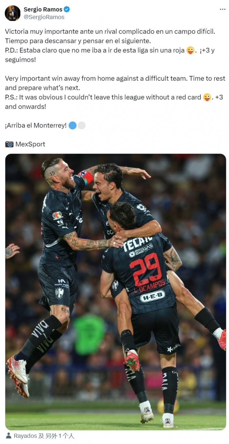 “附注——很明顯,我不能在沒吃到紅牌的情況下離開這個(gè)聯(lián)賽。全取三分,繼續(xù)前進(jìn),加油蒙特雷!”