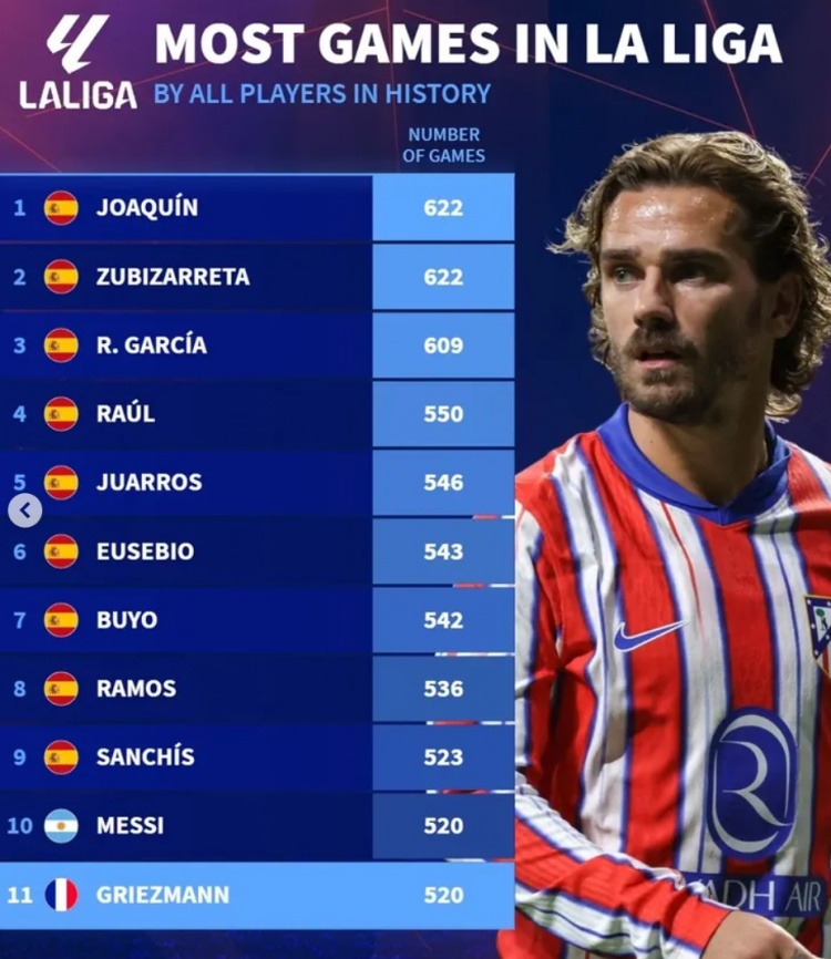 3月17日訊 馬競在本輪西甲焦點(diǎn)戰(zhàn)2-4被巴薩逆轉(zhuǎn),格列茲曼達(dá)成“里程悲”。數(shù)據(jù)統(tǒng)計顯示,他在本場比賽達(dá)成西甲生涯520場出場,追平梅西,并列西甲歷史出場榜前十。