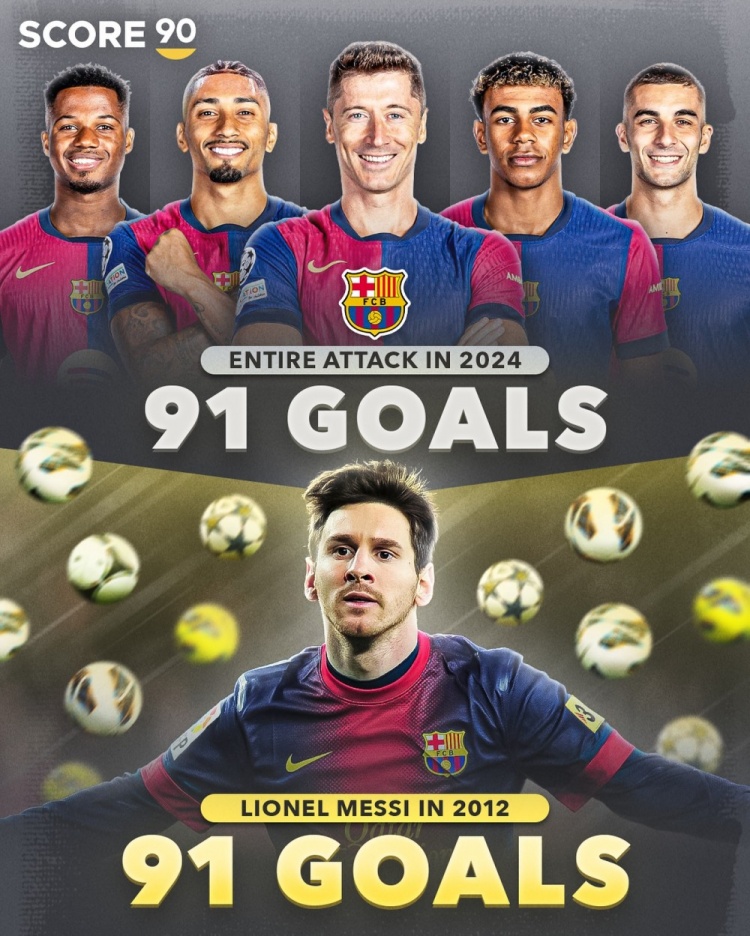 Score90指出,萊萬、拉菲尼亞、亞馬爾、費(fèi)蘭-托雷斯、法蒂2024年俱樂部+國家隊(duì)總計(jì)打進(jìn)91球,與梅西2012年一人進(jìn)球數(shù)量相同。