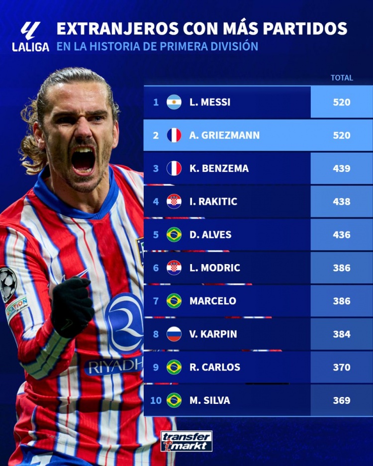 據(jù)德國(guó)轉(zhuǎn)會(huì)市場(chǎng)統(tǒng)計(jì),此役過(guò)后,格列茲曼已出戰(zhàn)520場(chǎng)西甲比賽,與梅西并列排名西甲歷史外援出場(chǎng)榜首位。