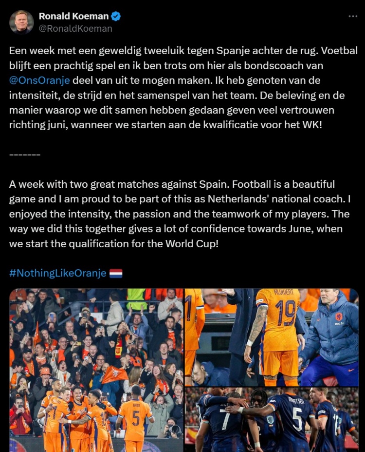 科曼表示:“我們本周與西班牙隊進(jìn)行了兩場精彩的對決。足球是一項美麗的運動,我很自豪能夠作為荷蘭國家隊教練參與其中。我很享受球員們展現(xiàn)出的激情、專注和團(tuán)隊合作。這樣出色的表現(xiàn),也讓我們對6月開始的世界杯預(yù)選賽充滿信心!”