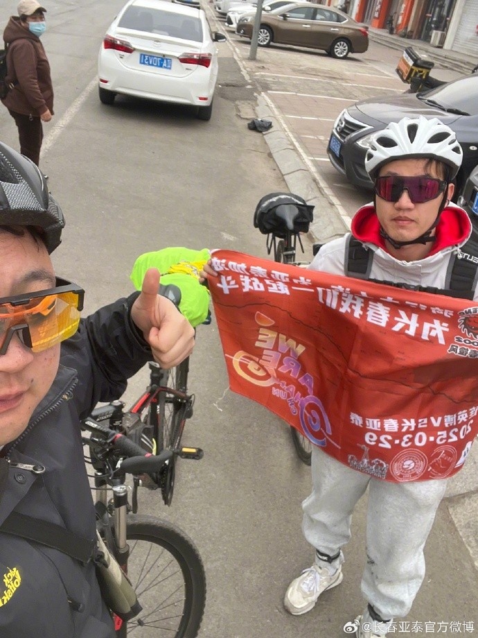 3月25日訊 根據(jù)亞泰俱樂部官方的消息,兩名亞泰球迷用長春騎行到大連的方式,前往大連客場(chǎng)為亞泰助威。