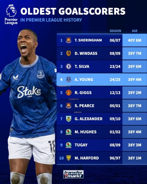 12月6日訊 在英超第14輪比賽中,阿什利-揚破門,幫助埃弗頓主場4-0大勝狼隊。據(jù)德國轉會市場統(tǒng)計,現(xiàn)年39歲4個月的阿什利-揚是英超歷史第4年長進球者。
