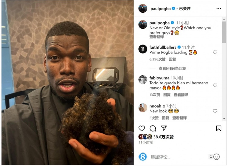 博格巴社媒曬出自己坐在理發(fā)椅子上的照片,他的手里拿著一大團(tuán)剪下的頭發(fā),配文:“新發(fā)型還是舊發(fā)型,你們更喜歡哪一個(gè)?”