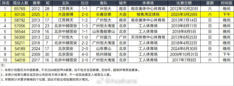 朱藝:今天,本輪(2025賽季中超第3輪)大連英博和長(zhǎng)春亞泰的比賽吸引了60126名觀眾現(xiàn)場(chǎng)觀戰(zhàn),這也是大連英博的首個(gè)中超主場(chǎng)比賽。這一數(shù)據(jù)在中超歷史上排名第二,僅次于2012年南京奧體的65769人。這也是繼那場(chǎng)之后中超聯(lián)賽第二次有超過(guò)六萬(wàn)名觀眾現(xiàn)場(chǎng)觀賽。