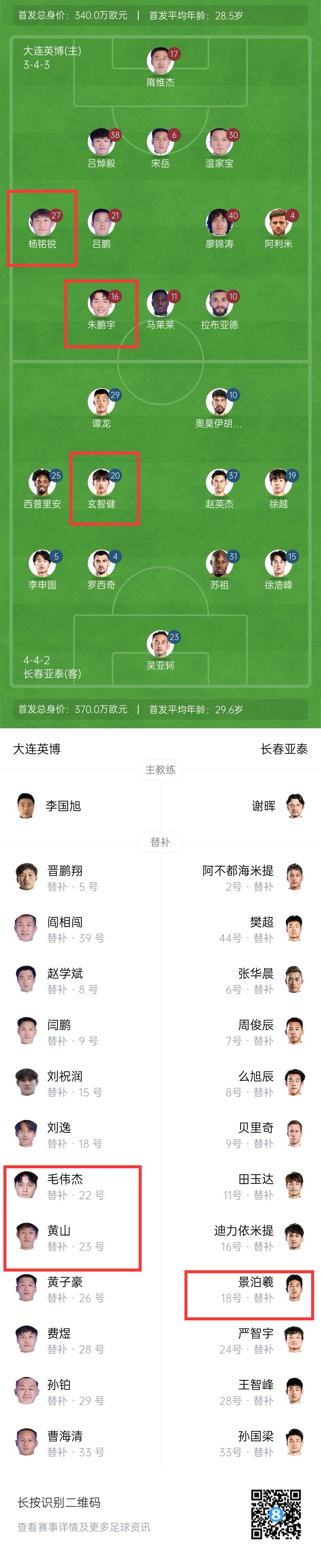 長(zhǎng)春亞泰:19歲玄智?。ㄊ装l(fā)),18歲景泊羲(替補(bǔ))。