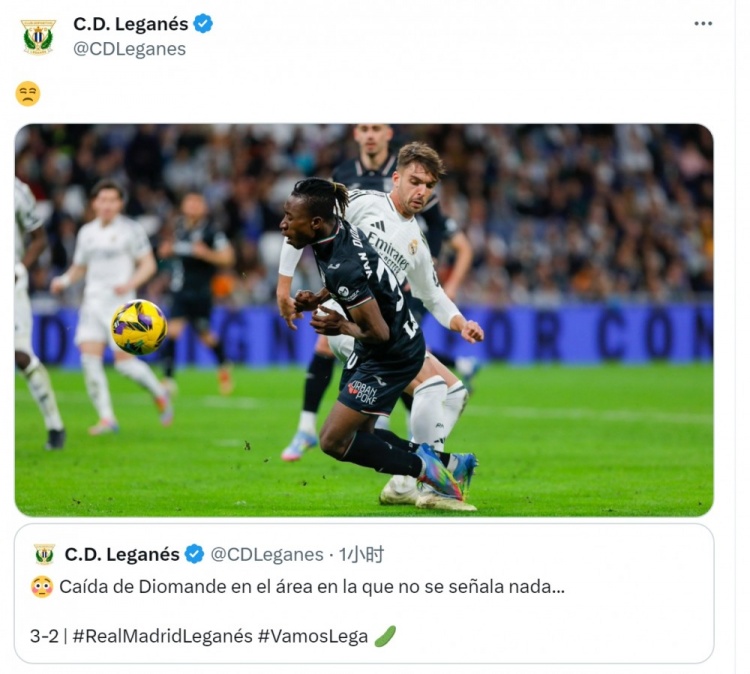 此役補時階段萊加內(nèi)斯球員迪奧曼德在皇馬禁區(qū)內(nèi)倒地,但裁判沒有判罰點球。