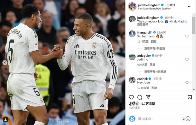 貝林厄姆社媒曬出與姆巴佩的合照,慶祝球隊(duì)取勝,配文:“逆轉(zhuǎn)兄弟團(tuán)!Hala Madrid!”