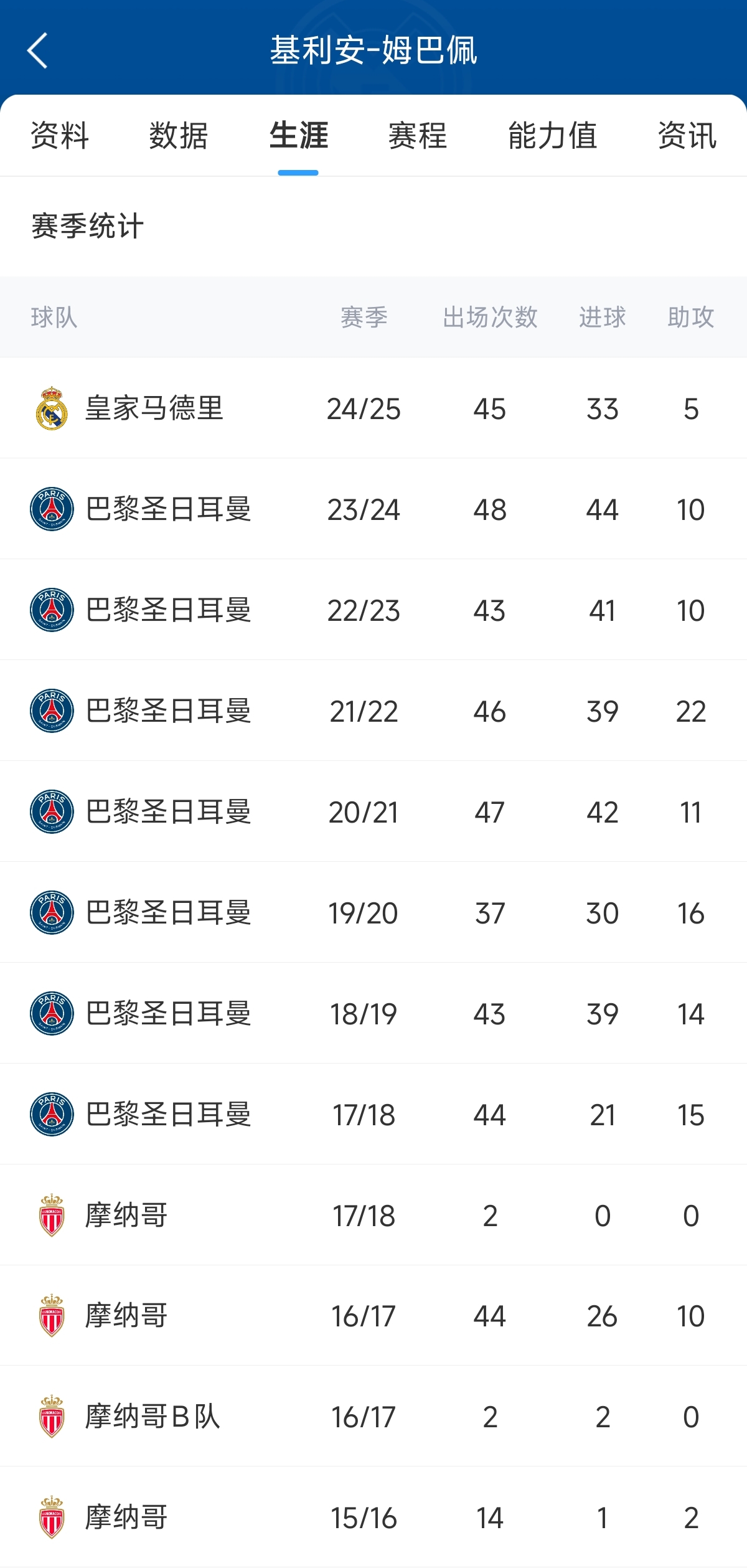 姆巴佩在皇馬的首秀賽季進(jìn)球數(shù)已達(dá)到33球,追平C羅的皇馬首秀賽季?;仡櫮钒团迓殬I(yè)生涯出道至今,他的表現(xiàn)一直都很不錯(cuò),除了生涯首秀賽季15/16賽季。那年年僅17歲的姆巴佩在一線隊(duì)只有1個(gè)進(jìn)球。但是從隨后的賽季開始,姆巴佩進(jìn)球數(shù)從來沒有低于20,且僅有前三個(gè)賽季低于30。