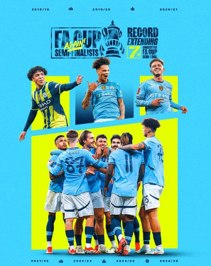 這也是曼城連續(xù)7個(gè)賽季打進(jìn)足總杯半決賽,這也是賽事歷史首次有球隊(duì)能做到這一點(diǎn)。