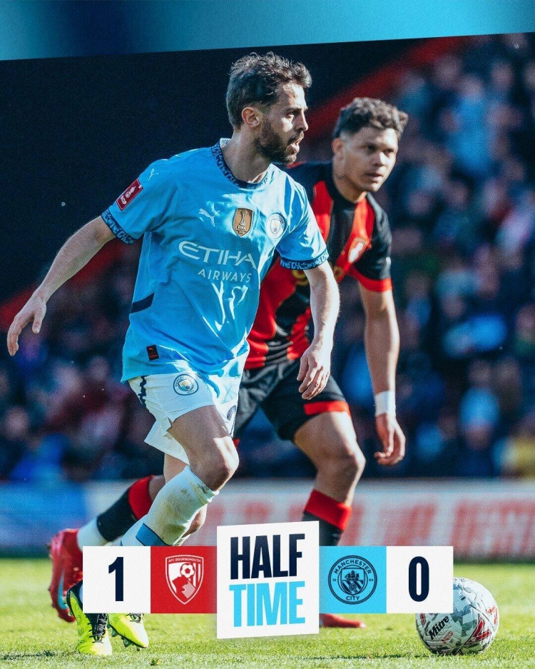 上半場傷停補時1分鐘,半場結束,伯恩茅斯暫1-0曼城。