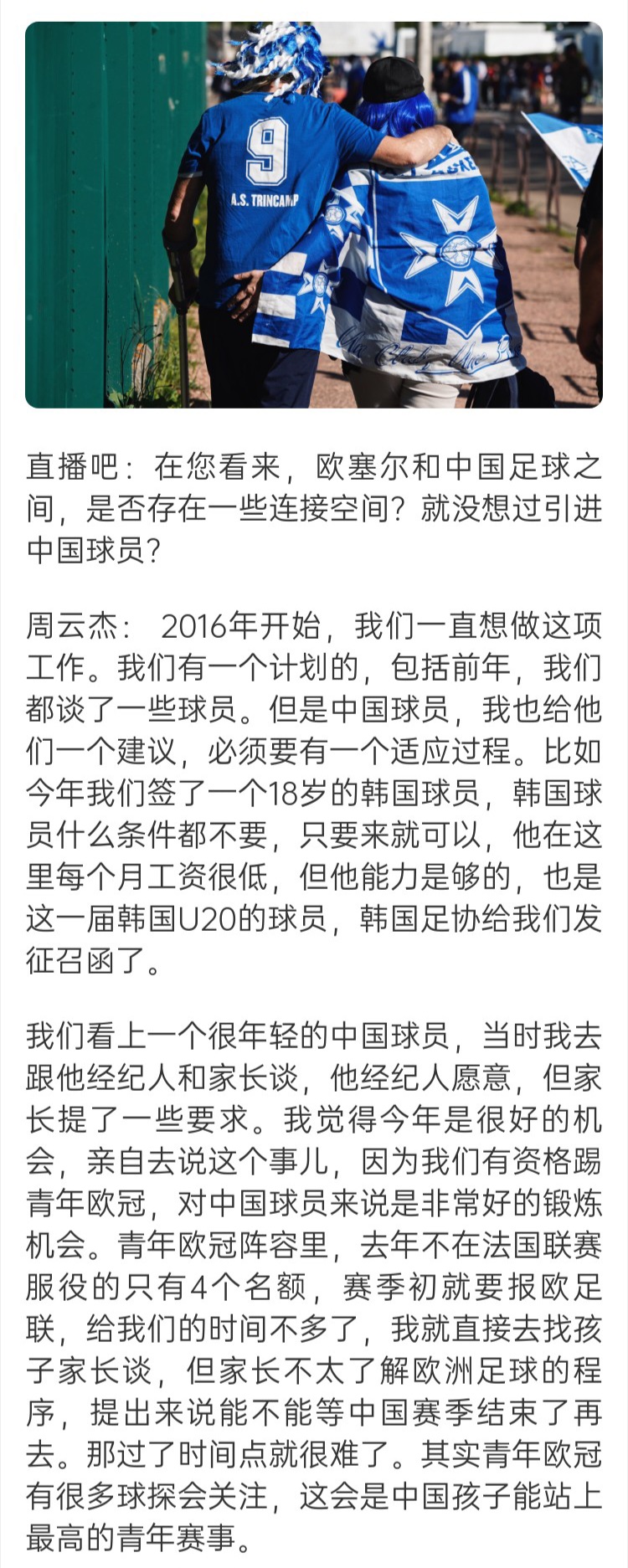 12月07日訊 近日對(duì)法甲球隊(duì)歐塞爾的投資人周云杰進(jìn)行了專訪,在被問(wèn)及是否想過(guò)引進(jìn)中國(guó)球員時(shí),周云杰提到了一名韓國(guó)球員,并將其與我們國(guó)內(nèi)的球員進(jìn)行對(duì)比。