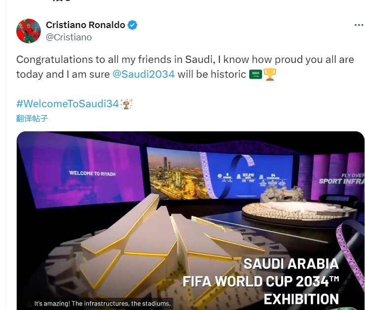 C羅在社交媒體上這樣寫道:“祝賀我所有在沙特的朋友,我知道今天你們有多自豪,我相信2034年世界杯是歷史性的?!?/p>