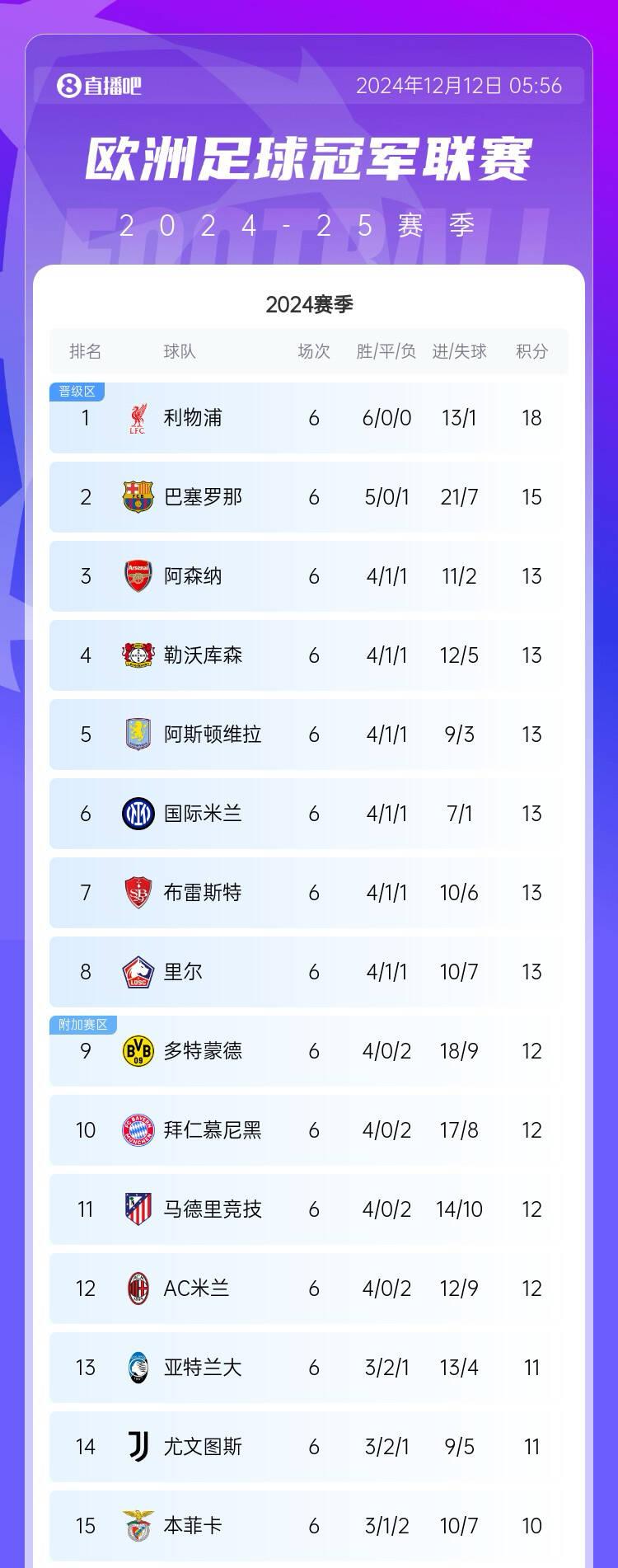 發(fā)布時間:2024年12月12日 08:02點擊:欄目:足球新聞 12月12日訊 歐冠聯(lián)賽階段進(jìn)行到第6輪,前八名有6隊同積13分,第9至第12名的四隊都是12分。歐冠聯(lián)賽階段還剩2輪,前八名直接晉級16強(qiáng),第9-24名需要踢附加賽。 除特別注明外,本站所有內(nèi)容均為24直播網(wǎng)整理排版,轉(zhuǎn)載請注明出處:激烈!歐冠積分前八有6隊同13分,第9至第12名都是12分 本文標(biāo)簽: 足球 英超 西甲 意甲 德甲 法甲 拜仁慕尼黑 多特蒙德 AC米蘭 國際米蘭 尤文圖斯 皇家馬德里 巴塞羅那 阿森納 阿斯頓維拉 布雷斯特 里爾 勒沃庫森 馬德里競技