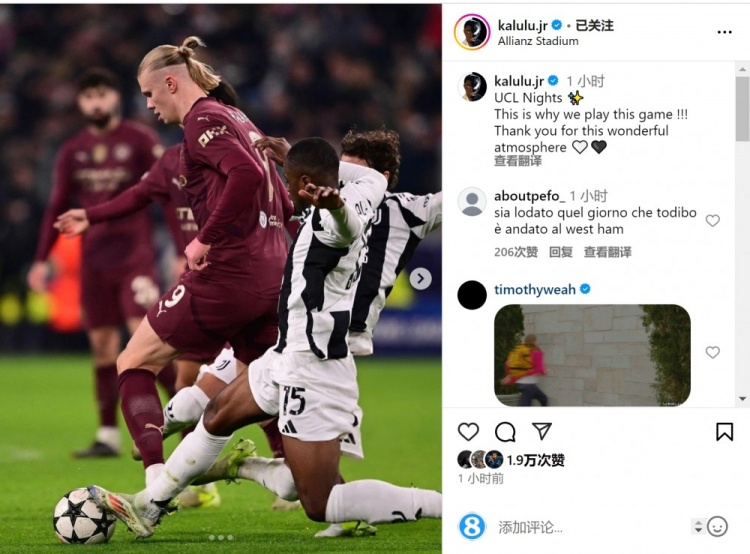 賽后卡盧盧在社交媒體上曬出鏟搶哈蘭德的照片,并寫道:“歐冠之夜,這就是為什么我們要踢足球!感謝球迷營造的美妙氛圍?!?/p>