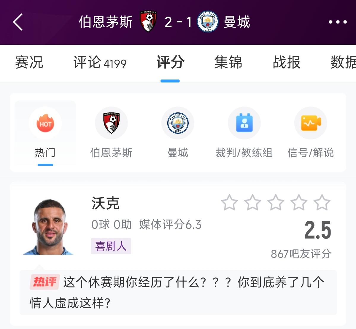12月12日訊 曼城的隊長沃克近期狀態(tài)拉胯,每場比賽都成為輸球的背景板。在曼城最糟糕的近期10場比賽中,34歲的沃克有3場沒上,其余7場全在被罵。唯一贏了的比賽獲評6分已經(jīng)是極限,那場比賽他沒有首發(fā),因此沒怎么被罵。
